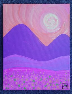 Join us for an afternoon of guided painting in a gallery setting. We will be working on a mountain landscape scene, with a field of flowers in the foreground.